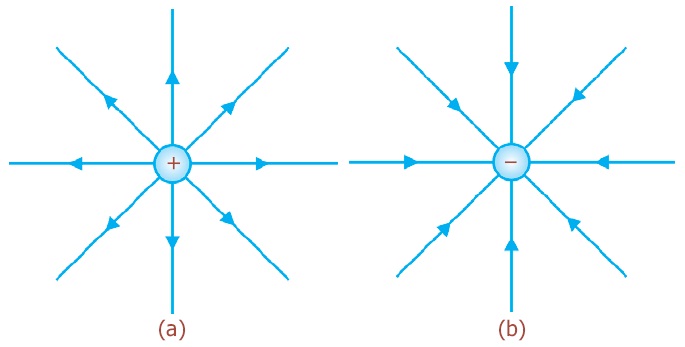 | Gambar 2. Garis-garis medan listrik (a) untuk satu muatan positif (b) untuk satu muatan negatif. |